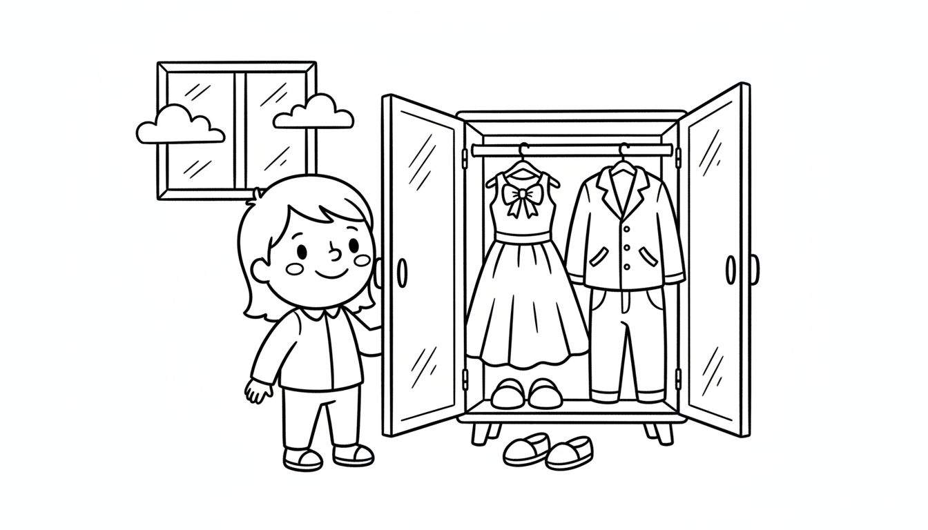 Deze charmante zwart-wit lijntekening nodigt kinderen uit om hun creativiteit de vrije loop te laten. Centraal in de scène staat een jong meisje, herkenbaar aan haar vrolijke glimlach en korte kapsel. Ze staat aan de linkerkant van de afbeelding, met haar hand rustend tegen de opengesperde deuren van een grote kledingkast. Dit tafereel straalt een sfeer uit van anticipatie en opwinding, alsof het meisje zich klaarmaakt voor een speciaal moment.