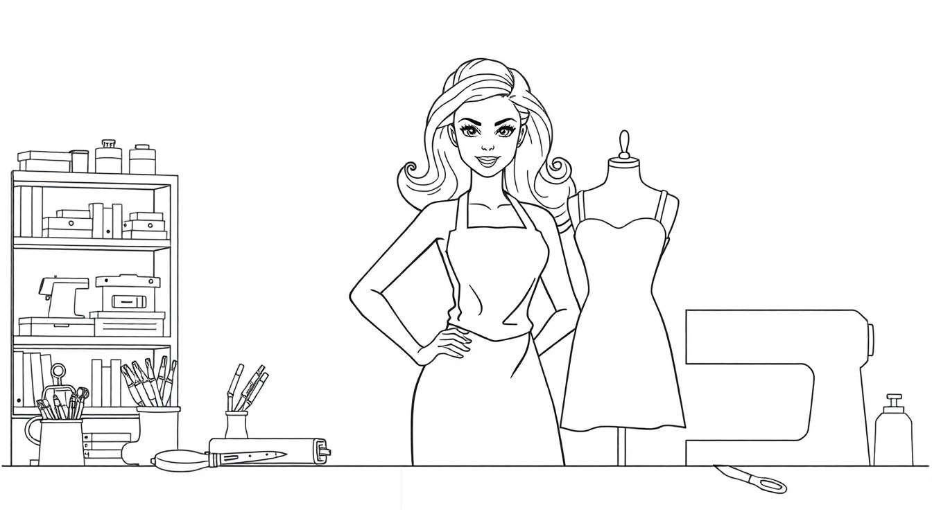 Duik in de wereld van mode en creativiteit met deze sfeervolle kleurplaat van een naaiatelier. De centrale figuur is een vrolijke vrouw, gekleed in een praktisch schort en met haar handen trots in de zij. Haar opgestoken haar suggereert focus en toewijding aan haar ambacht. De omgeving is rijk aan details die het hart van elke naaister sneller doen kloppen. Rechts van haar staat een paspop waarop een elegante jurk prijkt, een preview van het eindproduct van haar harde werk. Een robuuste naaimachine staat klaar voor actie, samen met een handig flesje met pompje. Op de voorgrond ligt een schaar, het onmisbare gereedschap voor elke naai-uitdaging. Dit tafereel ademt de sfeer van vakmanschap, passie en de vreugde van het creëren van iets moois met de hand.
