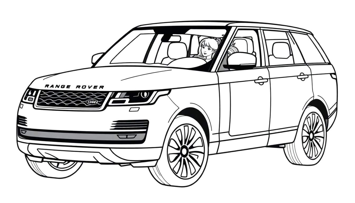 Gratis zwart-wit lijntekening van een Range Rover SUV, ideaal als kleurplaat. De tekening toont de auto vanuit een schuine hoek, met een lachende blonde vrouw achter het stuur. Perfect voor creatieve kinderen en autoliefhebbers!