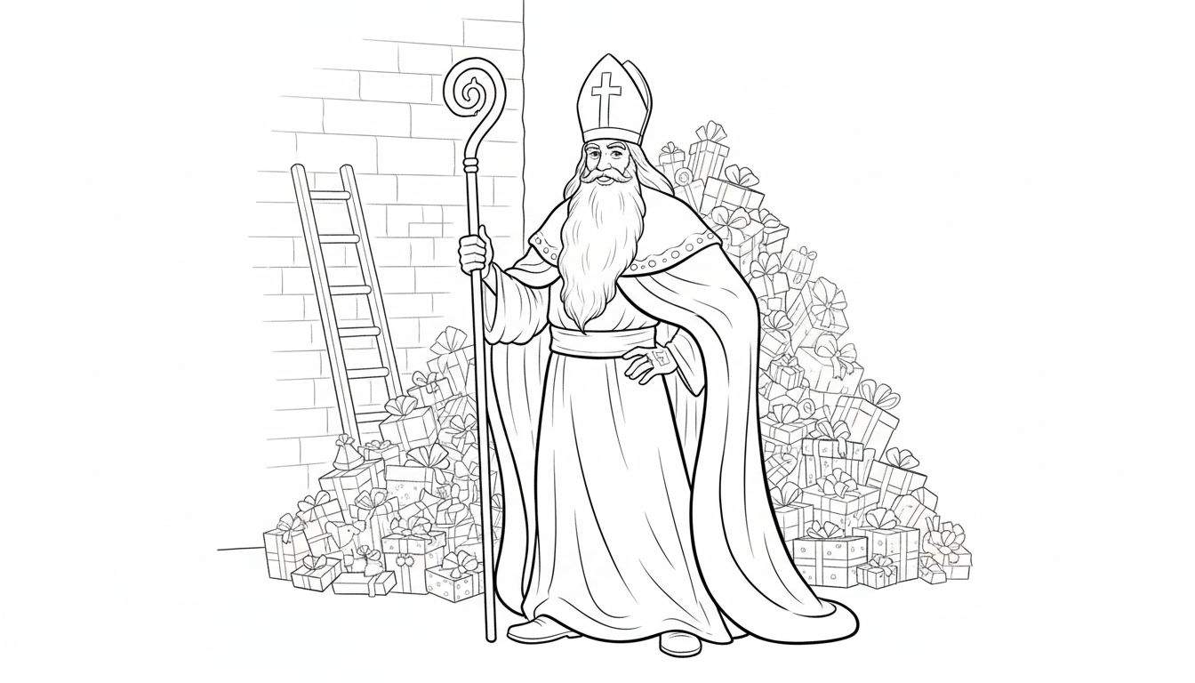 Een sfeervolle zwart-wit kleurplaat van Sinterklaas, omringd door stapels ingepakte cadeautjes. Sinterklaas staat in zijn traditionele kledij met mijter en kromstaf, bij een bakstenen muur met een leunende ladder. Perfect voor jonge kunstenaars om in te kleuren!