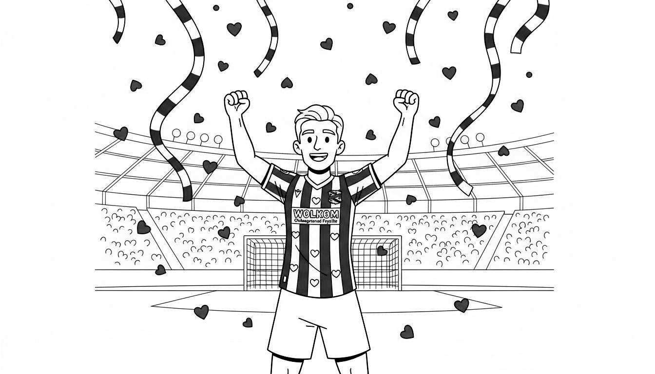Een vrolijke kleurplaat van een SC Heerenveen voetballer die feestviert na een overwinning. De speler staat juichend met de armen omhoog en gebalde vuisten, een brede glimlach op zijn gezicht. Hij draagt een gestreept zwart-wit voetbalshirt met de tekst ‘WOLKOM’ en ‘Oskeapert Frysile’, versierd met hartjes. Op de achtergrond is een voetbalstadion te zien met een doel en juichende menigte op de tribunes. Feestelijke zwart-wit gestreepte linten en kleine hartjes dwarrelen door de lucht, wat de feeststemming benadrukt.