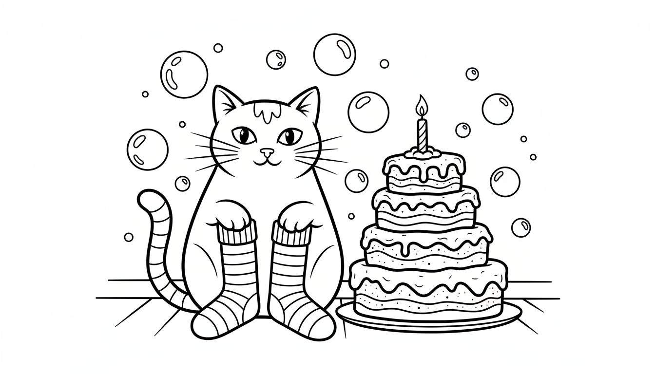 Download deze schattige zwart-witte kleurplaat van een lieve kat met gestreepte sokken, een vierlaagse verjaardagstaart en zwevende bellen. Perfect voor een vrolijke en feestelijke knutselmiddag!
