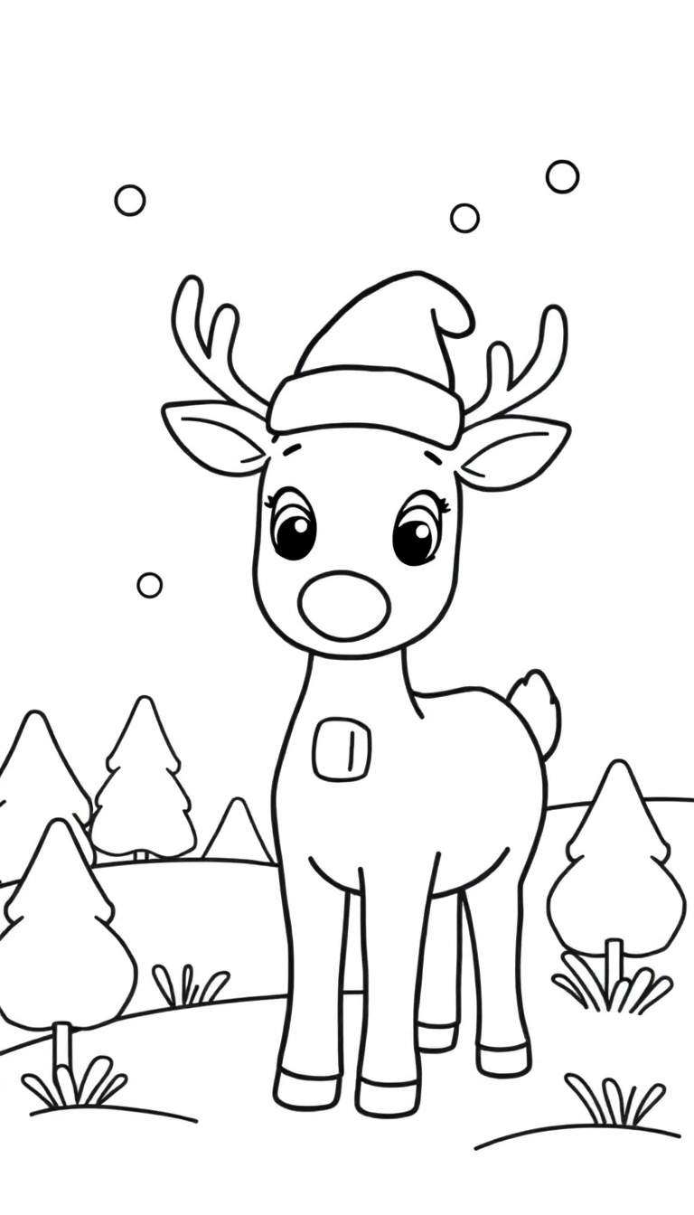 Download deze gratis zwart-wit kleurplaat van een schattig rendier met kerstmuts. Perfect voor kinderen om in te kleuren en de winterse kerstsfeer te beleven. Met een gezellig winterlandschap van dennenbomen en sneeuwvlokken.