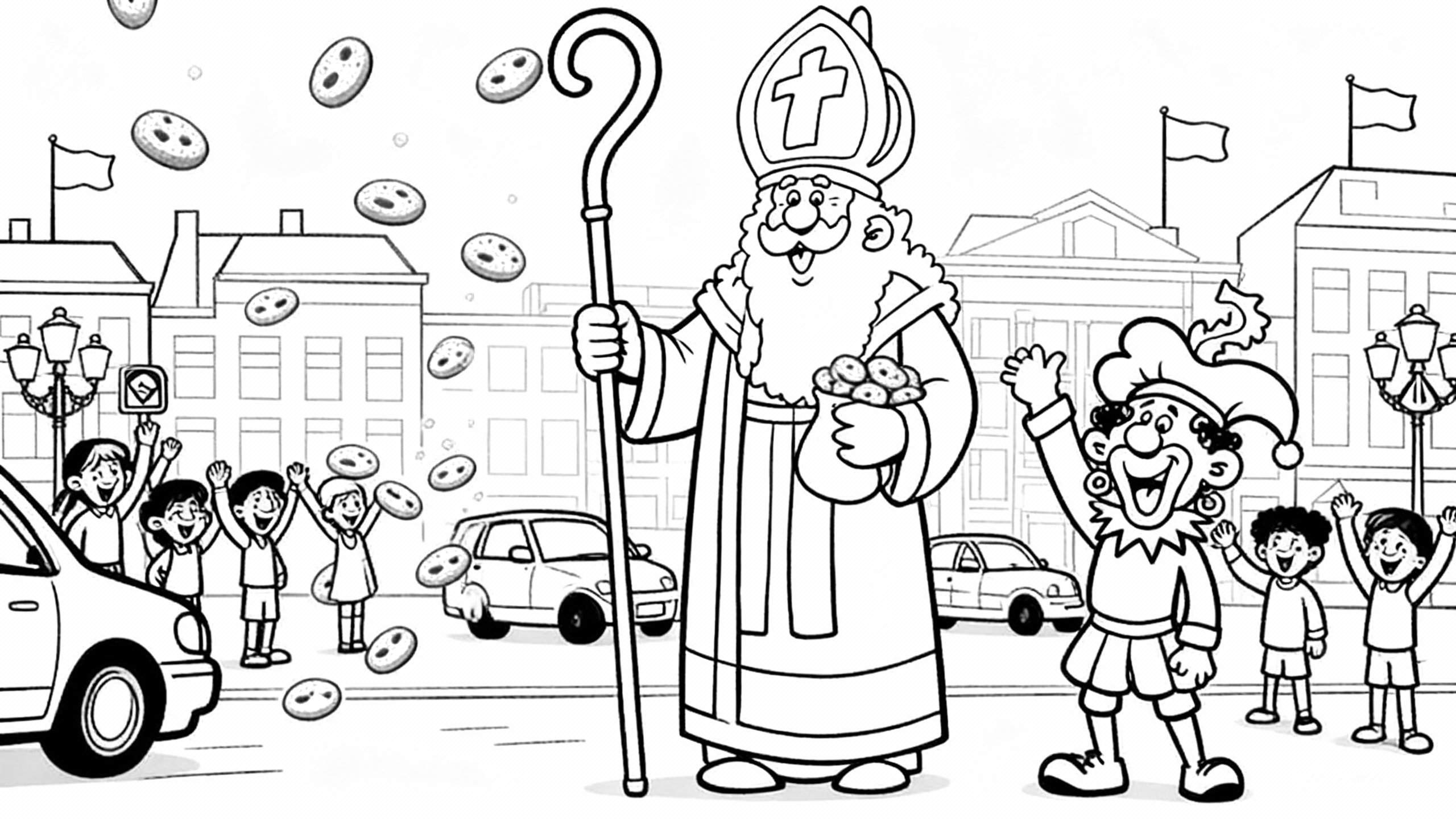 Een vrolijke Sinterklaas kleurplaat die de feestelijke intocht uitbeeldt. Centraal staat Sinterklaas met zijn staf en een zak pepernoten, geflankeerd door een enthousiaste Zwarte Piet. Rondom hen zwaaien blije kinderen, terwijl overal pepernoten vallen. Op de achtergrond is een levendig stadsgezicht te zien met huizen, vlaggen, auto’s en lantaarnpalen. Perfect voor kinderen om in te kleuren tijdens de Sinterklaasperiode.