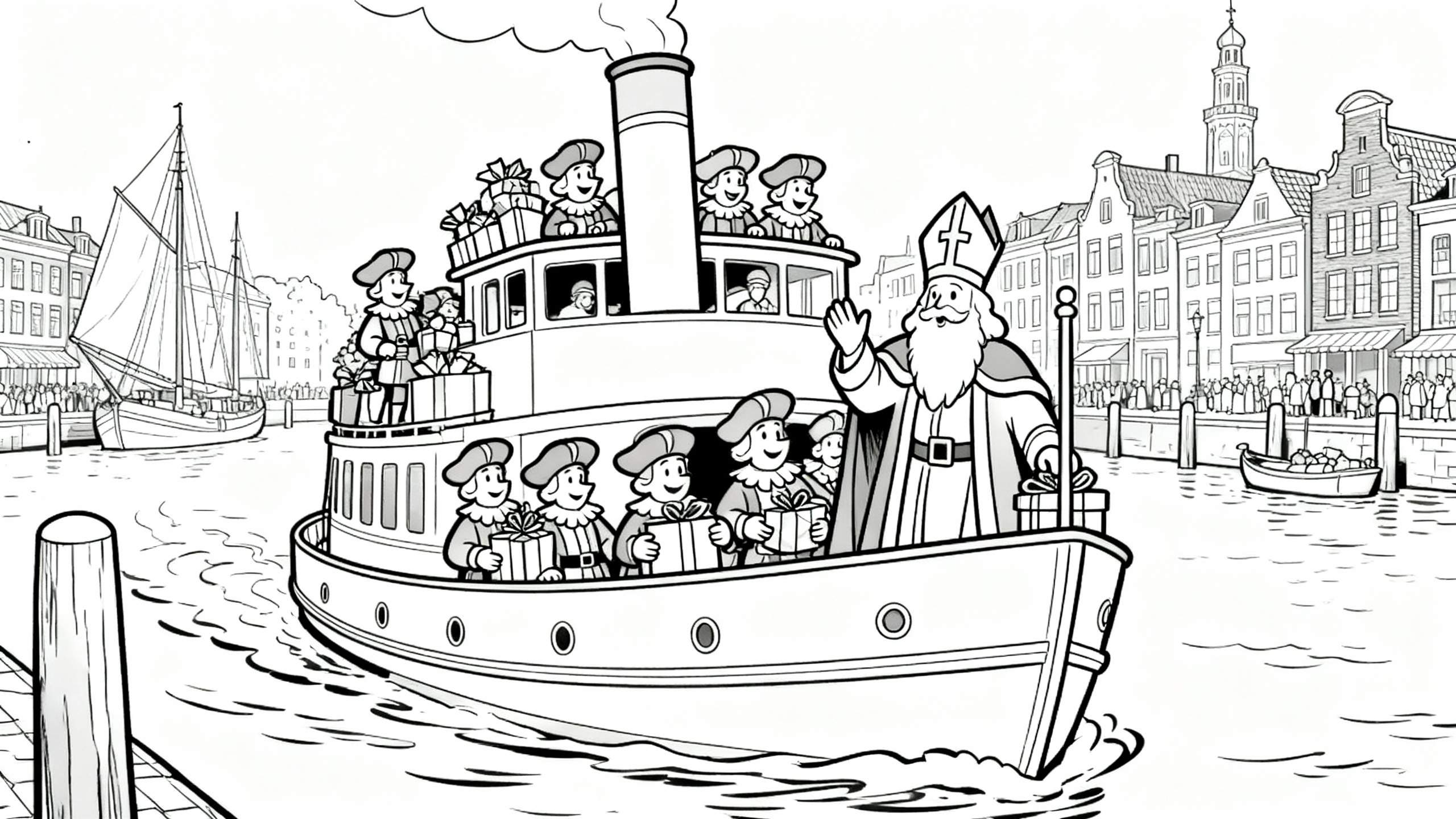 Deze gedetailleerde zwart-wit lijntekening toont de feestelijke aankomst van Sinterklaas met zijn stoomboot in een bruisende Nederlandse stad. Sinterklaas, met zijn mijter en tabberd, staat vooraan op de boot en zwaait vrolijk naar de toeschouwers langs de kade. Rondom hem en verder op de boot zijn veel Pieten te zien die stapels cadeautjes en pakjes dragen. De stoomboot heeft een grote schoorsteen waar rook uit komt. Op de achtergrond prijken karakteristieke grachtenpanden en een imposante kerktoren. Langs de kade staat een grote groep mensen te wachten, terwijl in het water diverse andere boten, waaronder een zeilboot en een roeibootje, dobberen. Het water is dynamisch weergegeven met golvende lijnen.