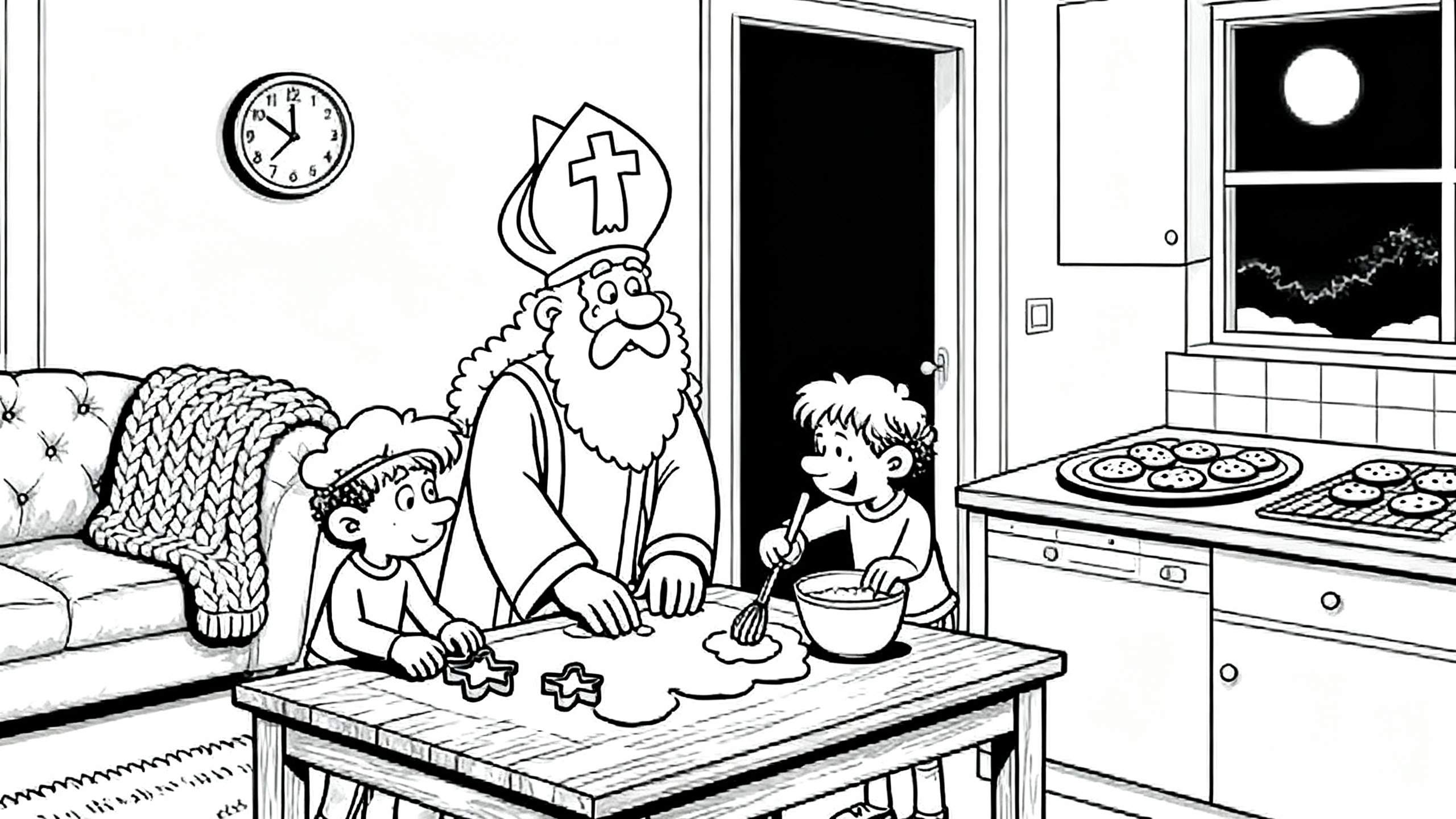 Een hartverwarmende zwart-wit kleurplaat toont Sinterklaas met twee vrolijke kinderen in een gezellige huiselijke setting, bestaande uit een woonkamer en keuken. Sinterklaas, met zijn kenmerkende baard en mijter, staat centraal terwijl de kinderen enthousiast koekjes bakken. Eén kind steekt sterrenkoekjes uit, de ander klopt beslag. De tafel is bedekt met deeg en vormpjes. Op de achtergrond is een comfortabele bank met deken te zien, met daarboven een klok die 8:45 aangeeft. Rechts is een aanrecht met al gebakken koekjes, keukenkastjes en een vaatwasser. Door het raam schittert een volle maan aan een nachtelijke hemel, wat de magische sfeer benadrukt. Een perfecte kleurplaat voor de Sinterklaasperiode vol warmte en plezier.