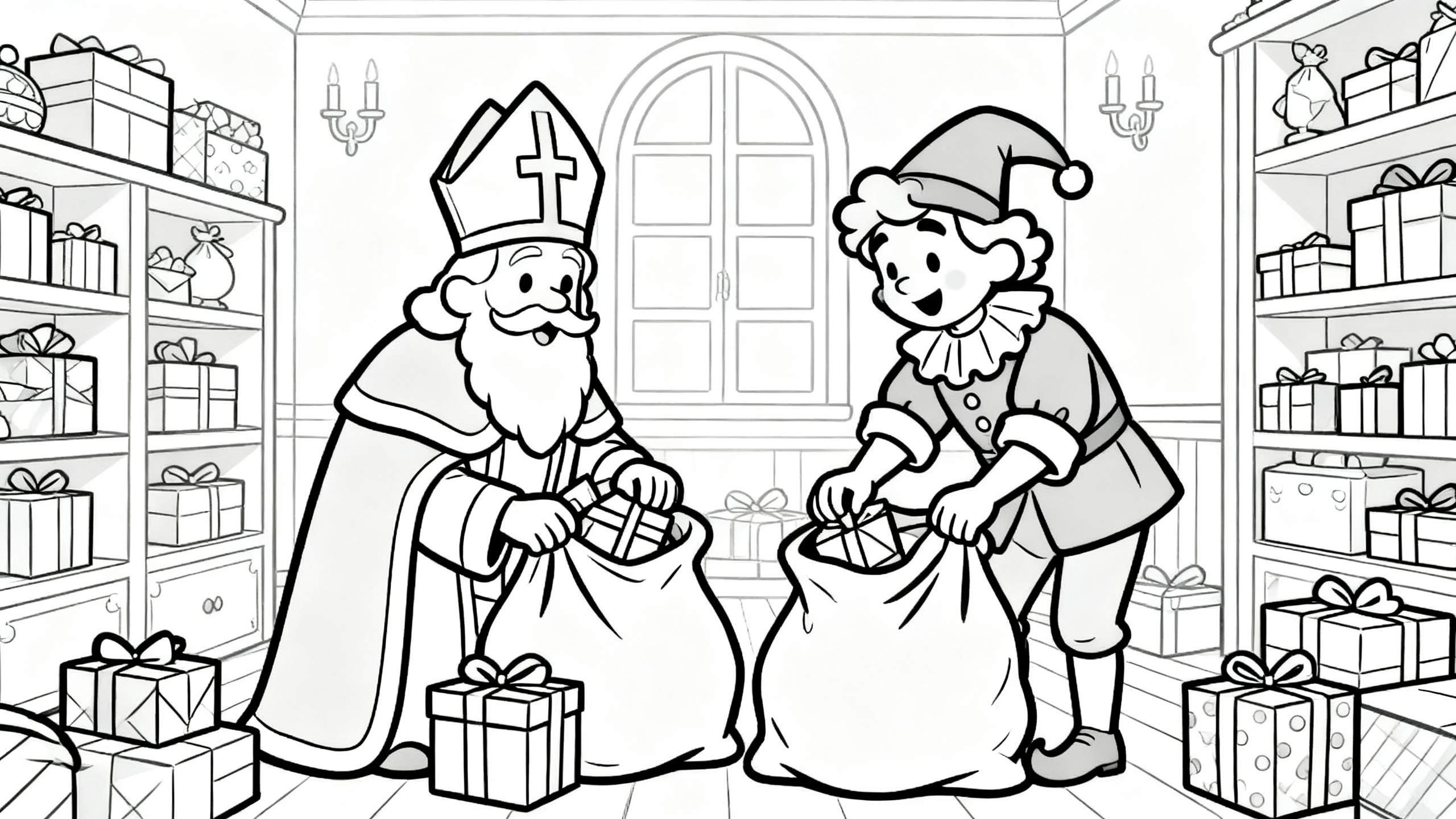 Deze feestelijke zwart-wit kleurplaat toont Sinterklaas en zijn vrolijke hulpje Piet die ijverig grote zakken vullen met stapels ingepakte cadeaus. De scène speelt zich af in de drukke werkplaats of het pakhuis van Sinterklaas, omringd door hoge planken vol met nog meer geschenken. Op de achtergrond is een groot boogvormig raam te zien en aan de muren hangen wandkandelaren, wat de magische sfeer compleet maakt. Een perfecte activiteit om je voor te bereiden op Pakjesavond!