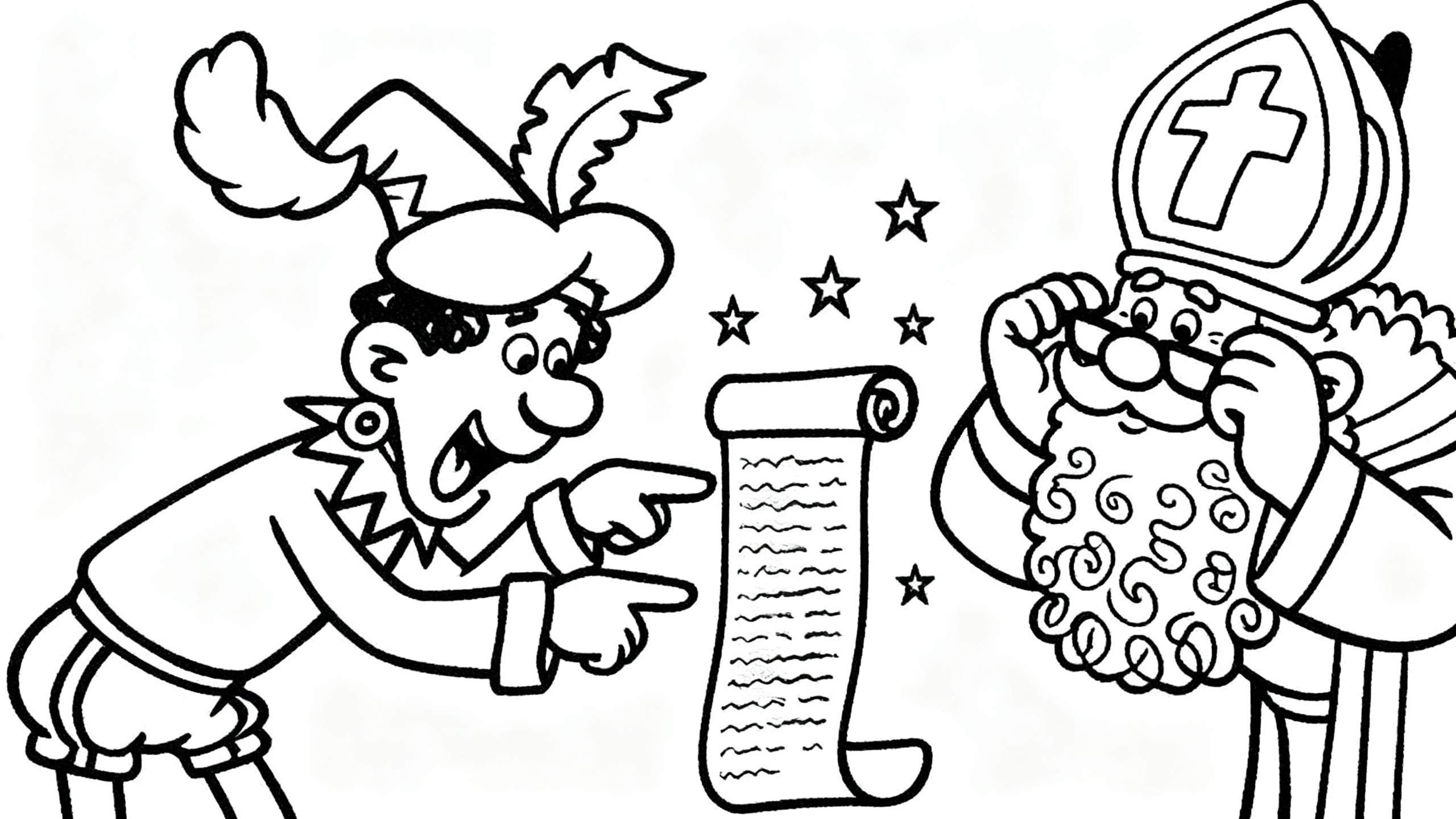 Deze prachtige zwart-wit kleurplaat vangt een klassiek moment uit de Sinterklaastijd: de Goedheiligman en zijn trouwe Piet die samen de belangrijke lijst doornemen. Met zijn bril stevig vastgehouden, bestudeert Sinterklaas de namen en wensen, terwijl Zwarte Piet met open mond en wijzende vingers duidelijk verrast of verbaasd is over wat er op het perkament staat. Het is een tafereel vol verwachting en spanning, precies zoals kinderen dat voelen vlak voor pakjesavond.