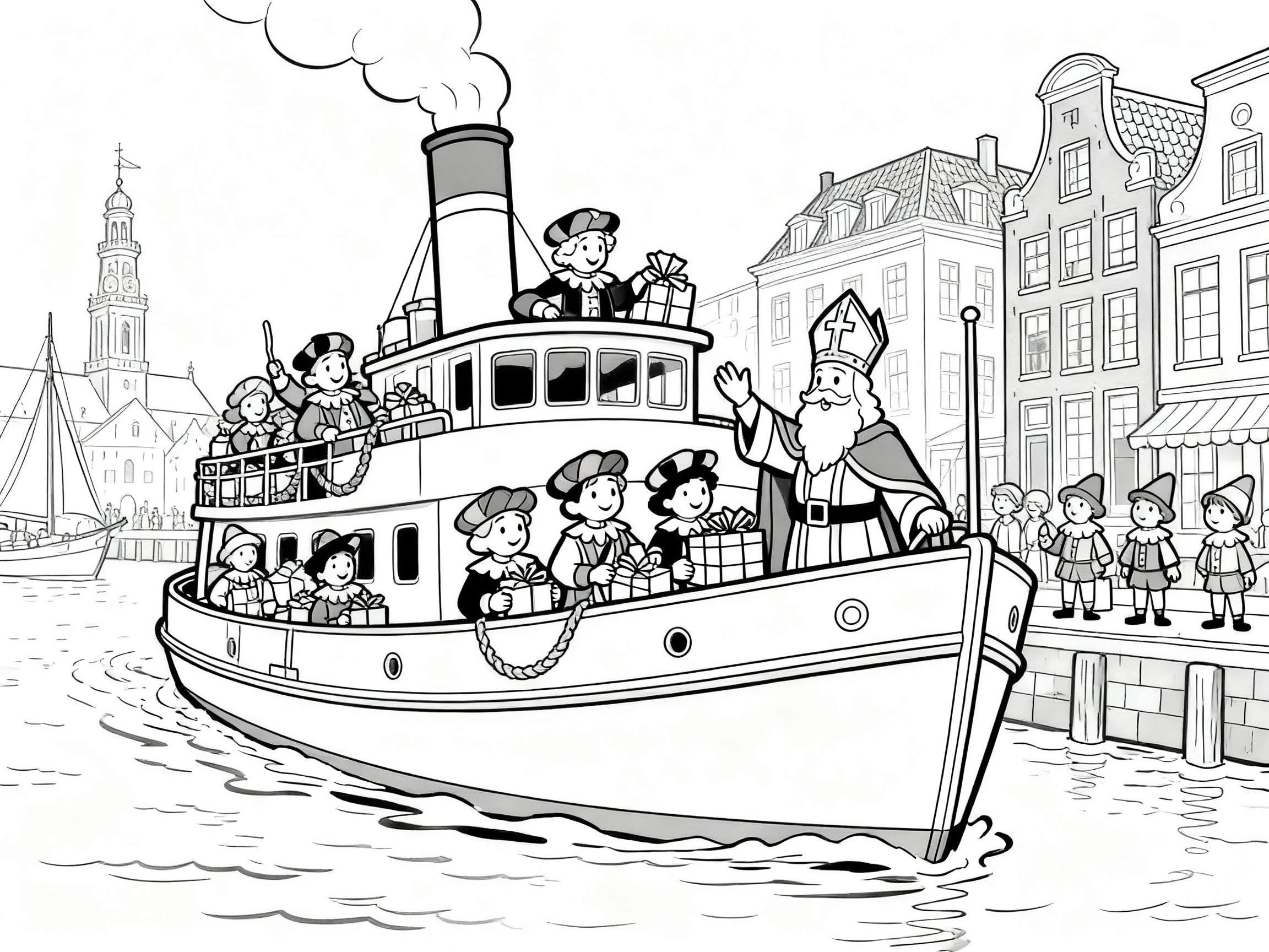 Wist je dat Sinterklaas eigenlijk inspiratie haalt uit Sint Nicolaas, de beschermheilige van onder andere zeelieden en kinderen? Dat verklaart meteen waarom hij altijd per boot aankomt! De stoomboot op deze kleurplaat is iconisch voor de Nederlandse traditie en symboliseert de lange reis vanuit Spanje. Let ook op de verschillende gevels van de grachtenpanden; trapgevels, halsgevels en klokgevels zijn typisch Nederlands en voegen een authentiek detail toe aan dit feestelijke tafereel. Het inkleuren van deze details kan een leuke manier zijn om meer te leren over Nederlandse architectuur en tradities!