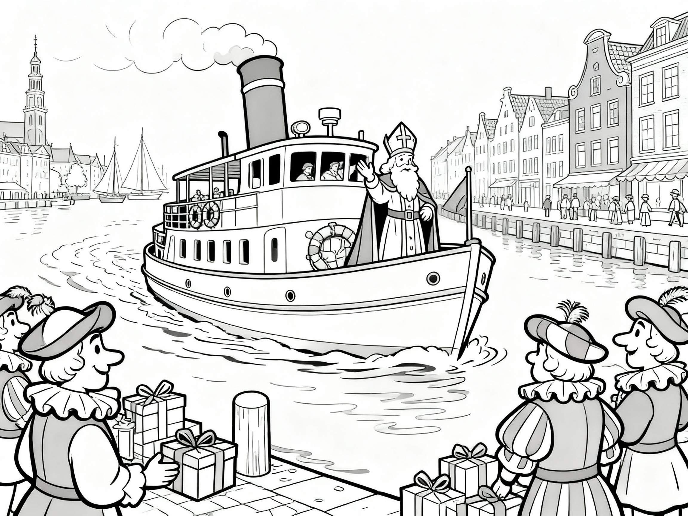 Deze prachtige zwart-wit lijntekening vangt de essentie van de jaarlijkse Sinterklaasintocht, een geliefde traditie in Nederland. Stel je voor hoe de stoomboot langzaam de haven binnenvaart, begeleid door het gejuich van honderden kinderen. Op het dek staat Sinterklaas zelf, met zijn statige mijter en lange baard, vriendelijk zwaaiend naar iedereen die hem heeft opgewacht. Achter hem zijn zijn trouwe Pieten druk bezig, klaar om de eerste cadeautjes uit te delen.
