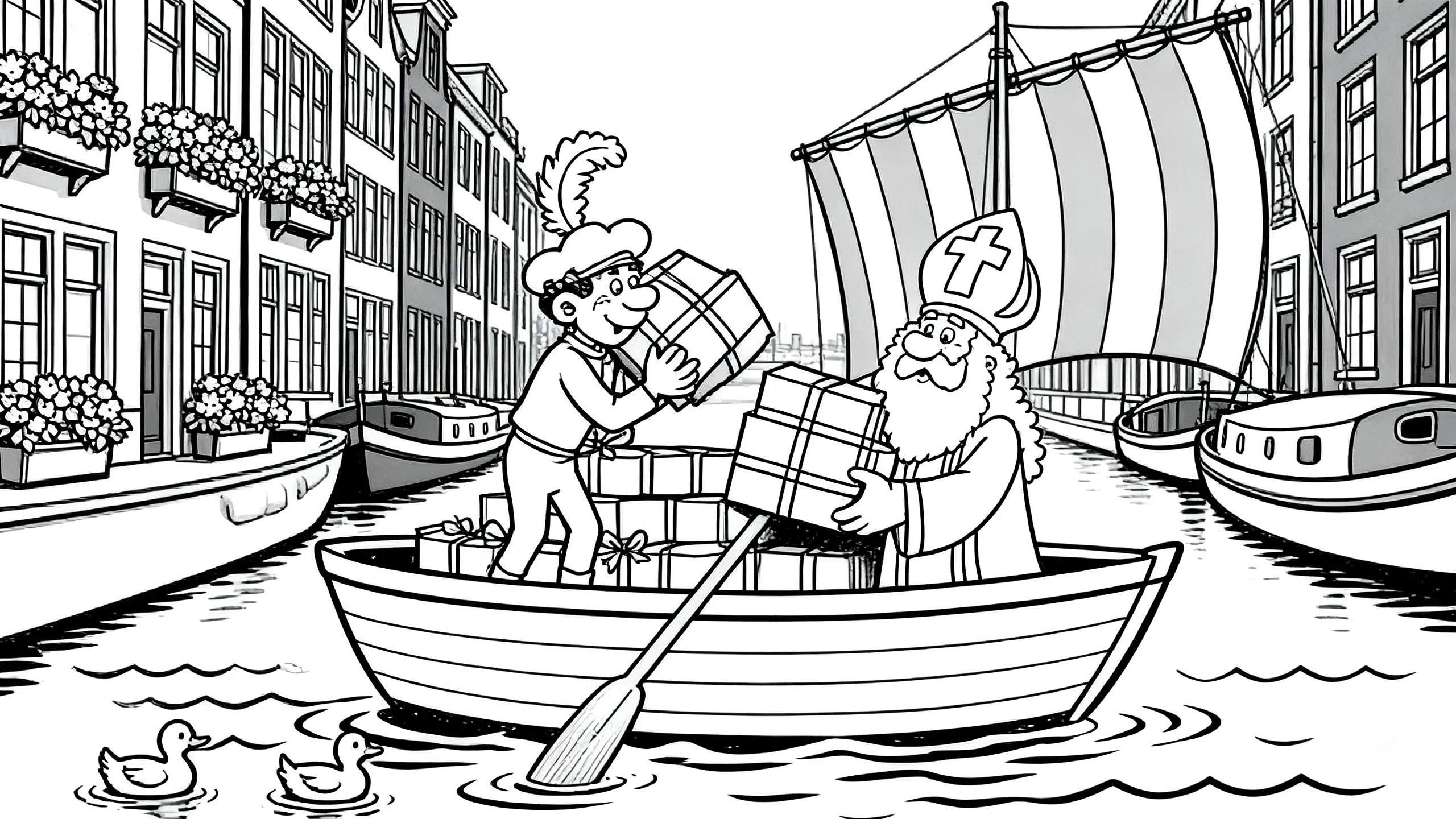 Sinterklaas Kleurplaat: Grachtenscène met Roeiboot, Piet en Cadeautjes