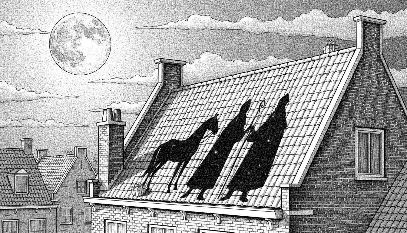 Stap in de magische wereld van Sinterklaasavond met deze prachtige, uitdagende kleurplaat, uitgevoerd in een unieke stippeltechniek. Je ziet een indrukwekkend tafereel van daken, met een groot pannendak op de voorgrond en omliggende bakstenen huizen met ramen. De nachtelijke sfeer wordt versterkt door een grote, heldere volle maan en zachte wolken aan een gestippelde hemel, die de illusie van sterren of een diepe nacht creëert. Het meest betoverende element zijn de lange, donkere schaduwen die over het centrale dak vallen: die van Sinterklaas’ paard en daarachter drie figuren, waarvan de middelste duidelijk Sinterklaas zelf is, herkenbaar aan zijn staf. Links, naast de schaduw van het paard, ligt een klein, ingepakt cadeautje te wachten. Diverse schoorstenen steken boven de daken uit, wachtend op de cadeautjes. Deze gedetailleerde tekening vangt perfect de spanning en anticipatie van Sinterklaasavond en is perfect voor volwassenen en oudere kinderen die houden van een creatieve uitdaging.