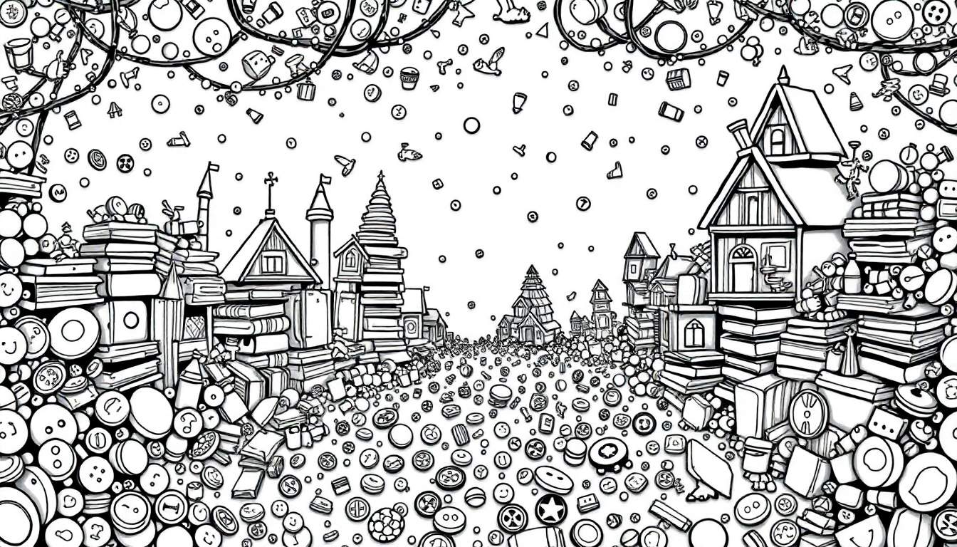 Een gedetailleerde zwart-wit kleurplaat van een fantasierijk landschap, opgebouwd uit alledaagse voorwerpen zoals knopen, flesjes, boeken en schroefjes. Een visueel avontuur voor jong en oud!
