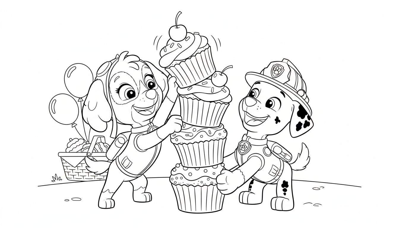 Deze schattige kleurplaat brengt de feestvreugde van Paw Patrol rechtstreeks naar jouw huis! We zien de altijd vrolijke Skye, met haar kenmerkende vliegersbril klaar voor avontuur, en de dappere brandweerhond Marshall, compleet met zijn helm en outfit. Samen vormen ze een onweerstaanbaar duo dat elk kind aan het glimlachen krijgt. De scène is één en al feest: een indrukwekkende stapel van vier overheerlijke cupcakes pronkt in hun pootjes, versierd met kersen die wachten om ingekleurd te worden in helder rood. Op de achtergrond maken vrolijke ballonnen en een mand vol verborgen lekkernijen het plaatje compleet.