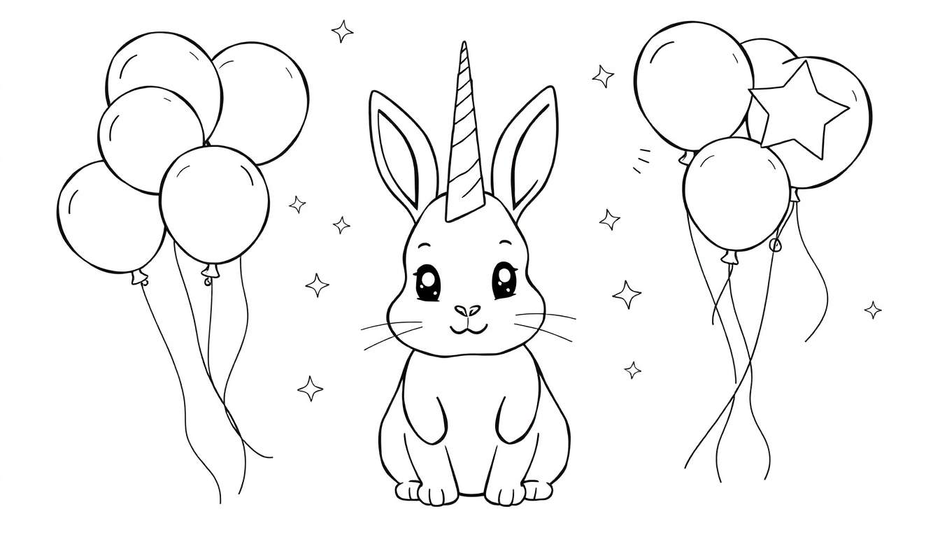 Ontdek deze betoverende eenhoorn konijn kleurplaat! Perfect voor urenlang kleurplezier, met een schattig konijntje, magische eenhoornhoorn, vrolijke ballonnen en fonkelende sterretjes. Download deze gratis kleurplaat voor kinderen en laat de creativiteit stromen!