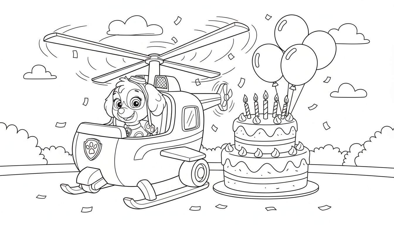 Een levendige zwart-wit kleurplaat waarop Skye van Paw Patrol breed lacht vanuit de cockpit van haar helikopter, compleet met bewegende rotorbladen. Naast de helikopter staat een tweelaagse verjaardagstaart versierd met kaarsjes en toefjes glazuur, geflankeerd door vier zwevende ballonnen. De achtergrond toont wolken en dwarrelende confetti, wat een heerlijk feestelijke sfeer creëert, perfect om in te kleuren.