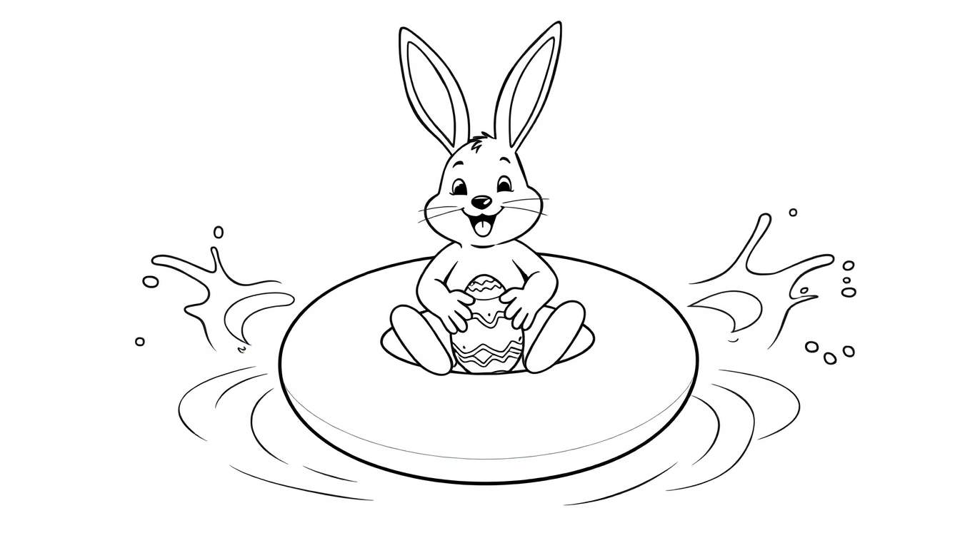 Duik in de feestelijke sfeer van Pasen met deze betoverende kleurplaat! We zien een onweerstaanbaar vrolijk konijntje, getekend met duidelijke, schone lijnen, dat zich laat meevoeren op het water in een kleurrijke zwemband. Het water spat rondom, de rimpelingen suggereren beweging en spel – een perfecte uitbeelding van pure waterpret. Met zijn brede glimlach straalt het konijntje pure vreugde uit, en in zijn pootjes houdt het een prachtig versierd paasei vast. De patronen op het ei, zoals golven en zigzags, nodigen uit tot een explosie van kleur.