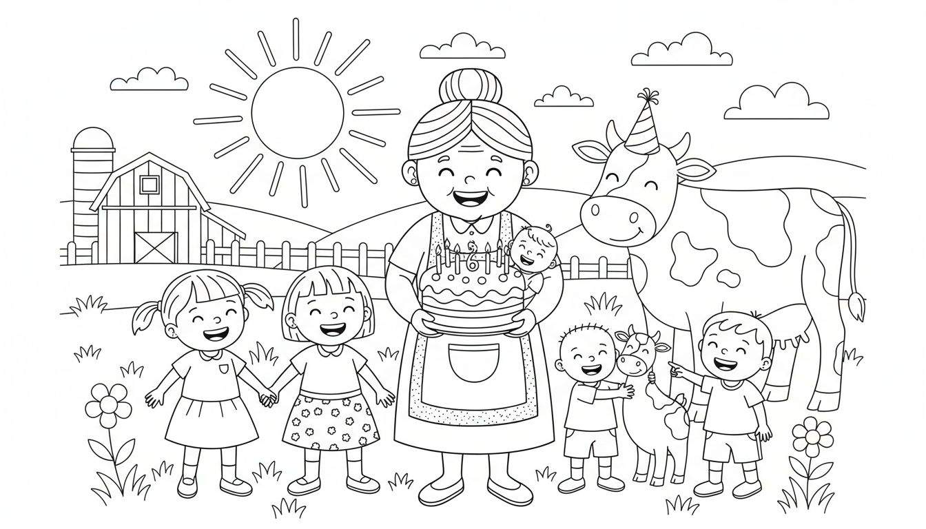 Kleurplaat van een vrolijke boerderijscène ter ere van oma’s 61e verjaardag. Oma lacht terwijl ze een taart met kaarsen vasthoudt en een baby in haar armen draagt. Kinderen, een vriendelijke koe, kalfjes en een schilderachtig boerenlandschap maken dit feestelijke tafereel compleet.