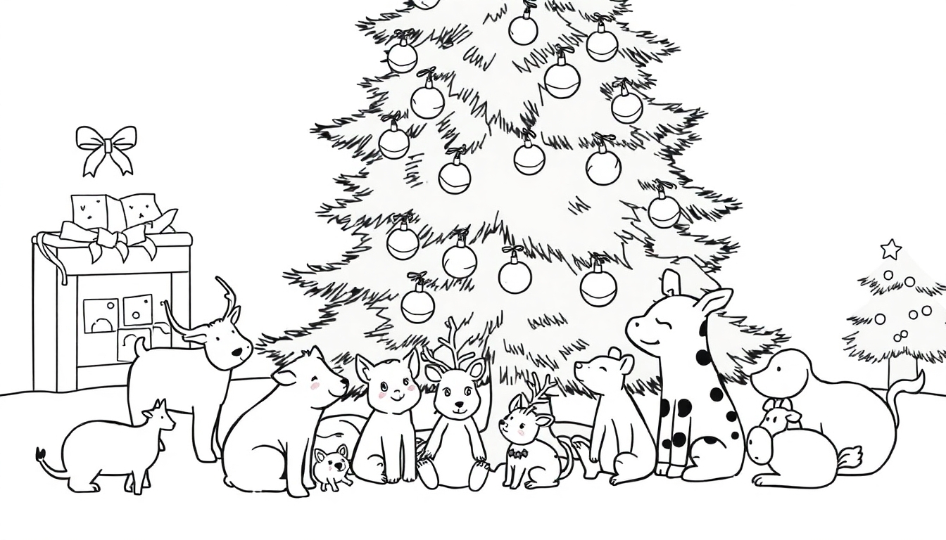 Gratis zwart-wit lijntekening van een sfeervolle kersttafel met een grote, versierde kerstboom, cadeautjes, en een vrolijk gezelschap van dieren zoals hertjes, honden, een giraffe, een konijn en een lammetje. Perfect om in te kleuren!