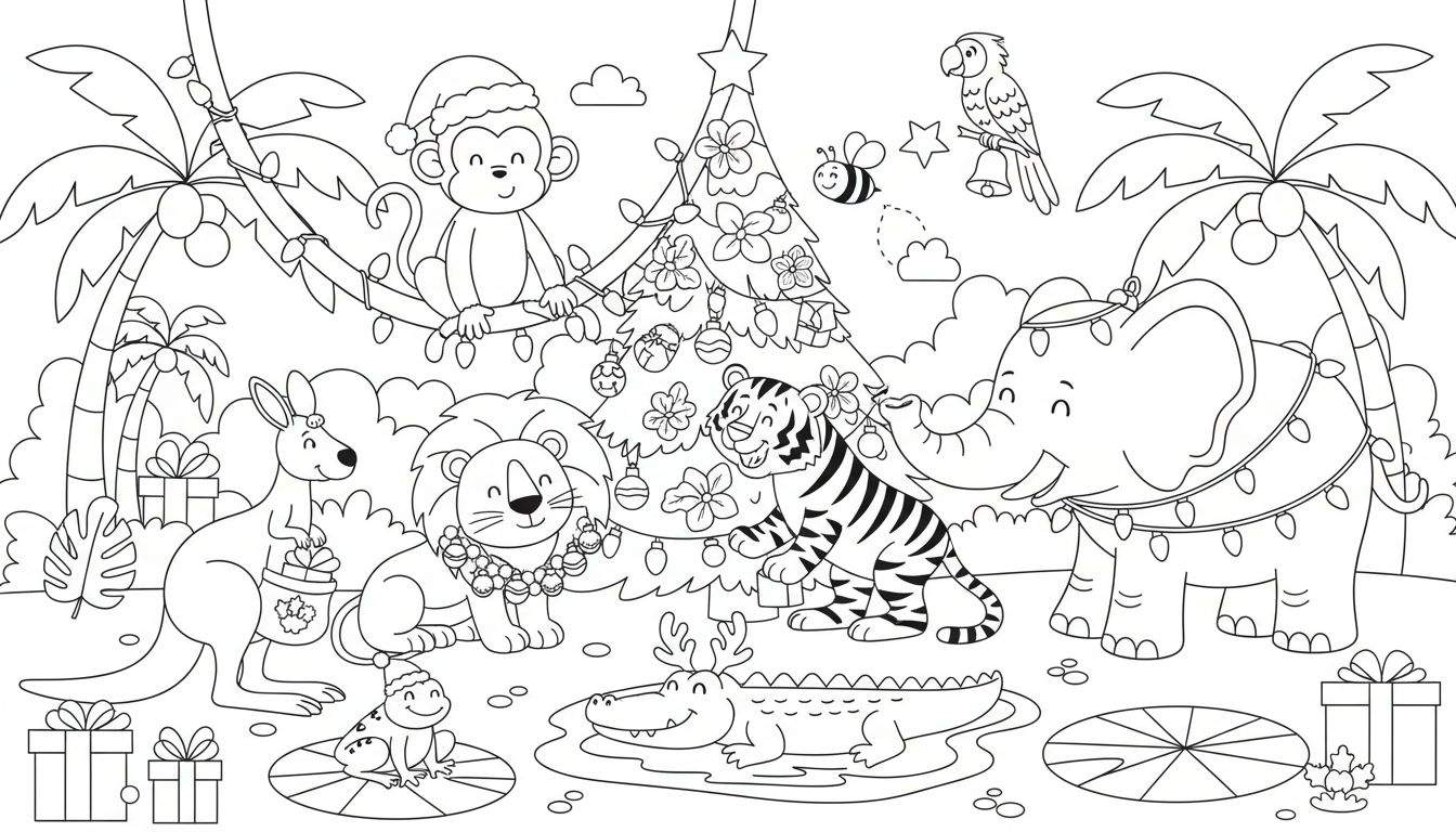 Deze unieke kleurplaat neemt je mee naar een zonnige jungle waar het kerstfeest wordt gevierd. In het hart van de afbeelding staat een prachtig versierde kerstboom, omringd door tropische planten en palmbomen. Rondom deze feestelijke boom vind je een bonte verzameling dieren die duidelijk in een kerstsfeer zijn.