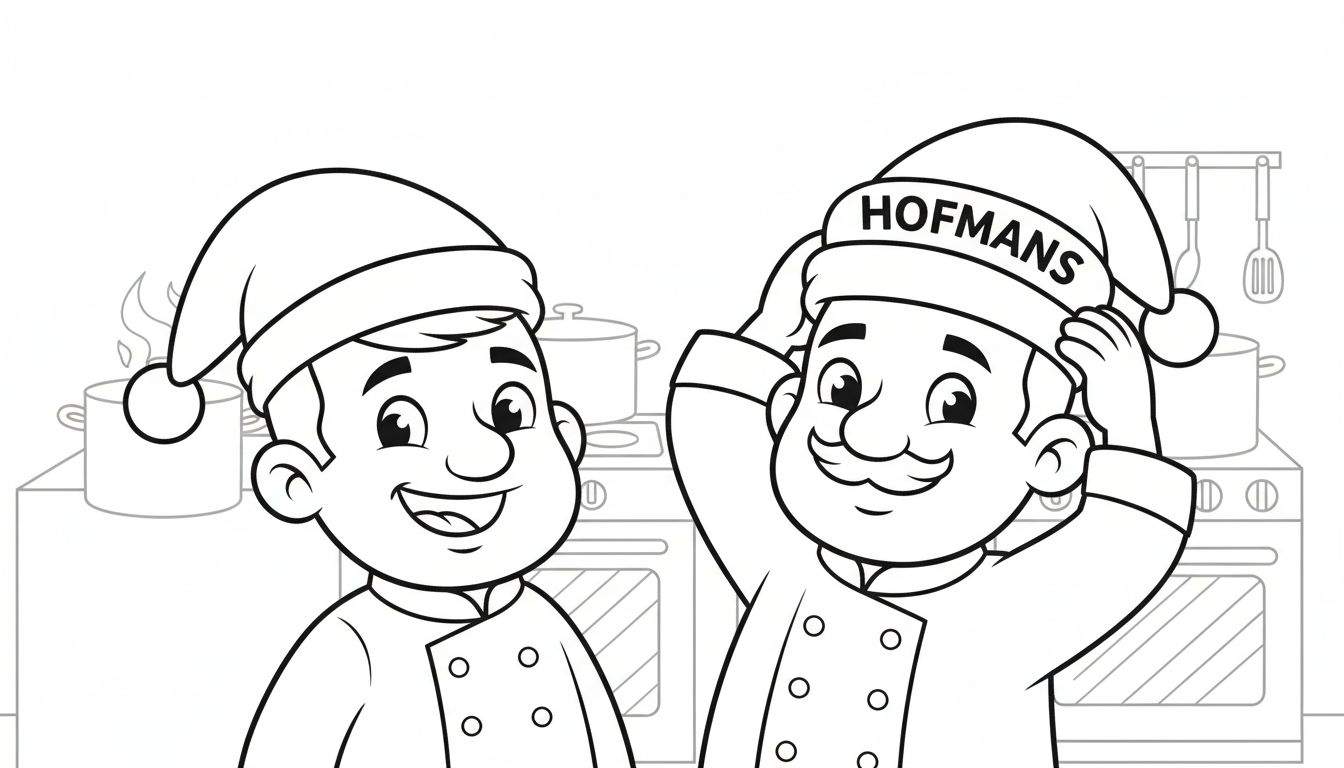 Stap de keuken in en maak je klaar voor een smakelijke tekenervaring met deze unieke kleurplaat! We zien twee hartelijke koks, gehuld in hun koksoutfit en vrolijk versierd met kerstmutsen, druk in de weer in een sfeervolle keuken. De kok links straalt met een brede lach naar voren, terwijl zijn collega aan de rechterkant, herkenbaar aan zijn snor en de naam “HOFMANS” op zijn muts, lachend zijn kerstmuts vasthoudt. De achtergrond is gevuld met alles wat een kok nodig heeft: dampende pannen op het aanrecht, ovens eronder en een pollepel hangend aan de muur. Dit plaatje ademt feest en gezelligheid, perfect om met levendige kleuren tot leven te wekken.
