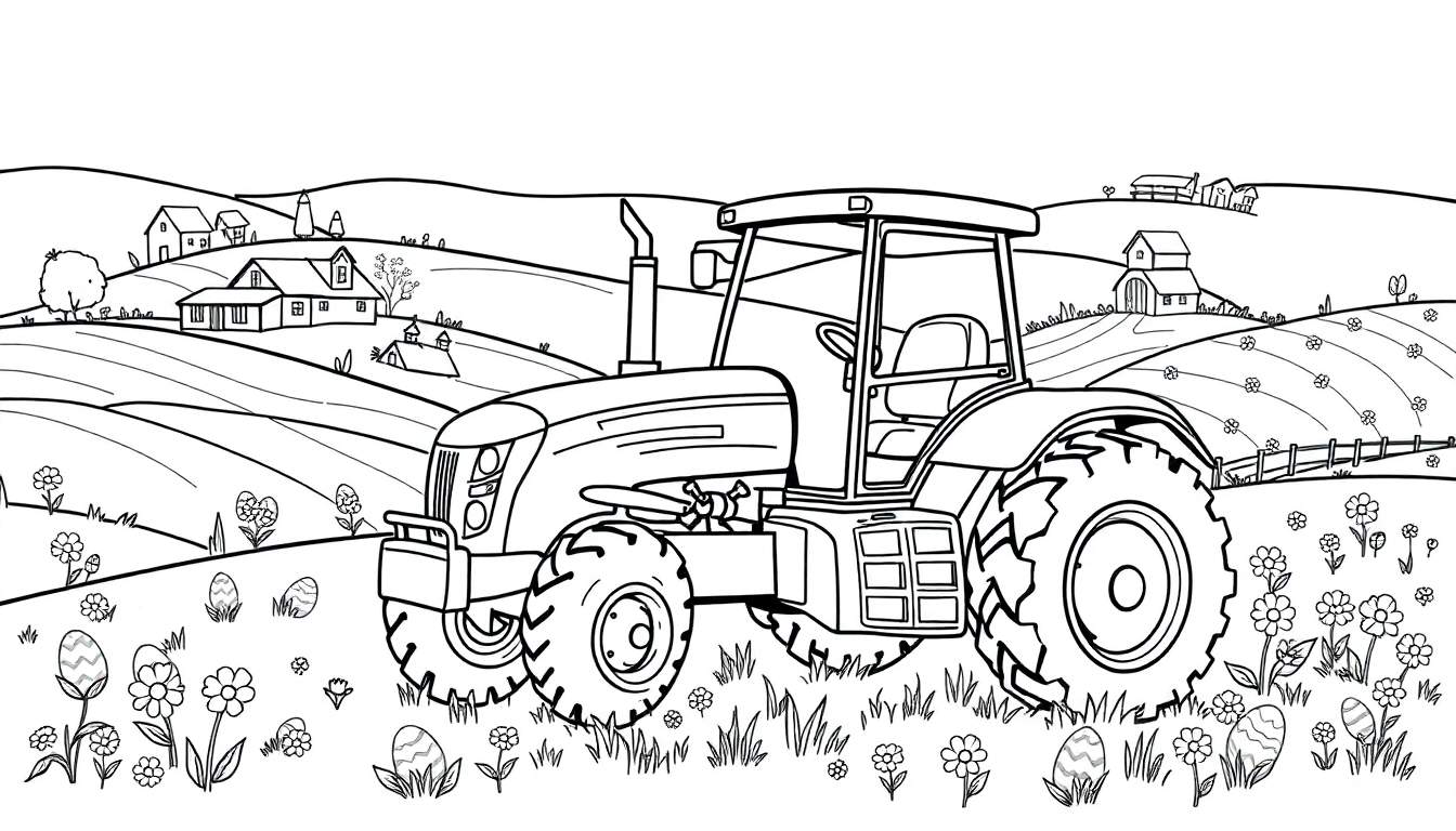 Een gedetailleerde zwart-witte kleurplaat van een levendig boerderijlandschap, perfect voor de lente en Pasen. De tekening bevat een grote trekker op de voorgrond, glooiende heuvels met boerderijen en huizen, bewerkte velden met bloemen, paaseieren en bomen. Nodigt uit tot creatief inkleuren!