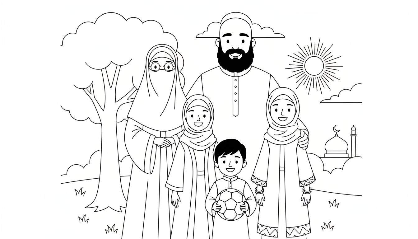 Deze prachtige kleurplaat toont een hartverwarmend tafereel van een moslimfamilie van vijf, volop genietend van elkaars gezelschap. Centraal staat de vader, herkenbaar aan zijn kale hoofd, volle baard en traditionele gewaad, wiens brede glimlach de warmte van het gezin uitstraalt. Naast hem staat de moeder, gehuld in een niqab met alleen haar ogen en bril zichtbaar, en haar hand teder vasthoudend van hun jonge dochter. Deze dochter, die trots een hijab en een lang gewaad draagt, straalt eveneens pure blijdschap uit. Aan de andere zijde van de vader zien we nog een dochter, eveneens vrolijk met haar hijab en gewaad. Vooraan, het stralende middelpunt, staat de jonge zoon, bal in de hand en een brede lach op zijn gezicht, klaar voor een potje voetbal.
