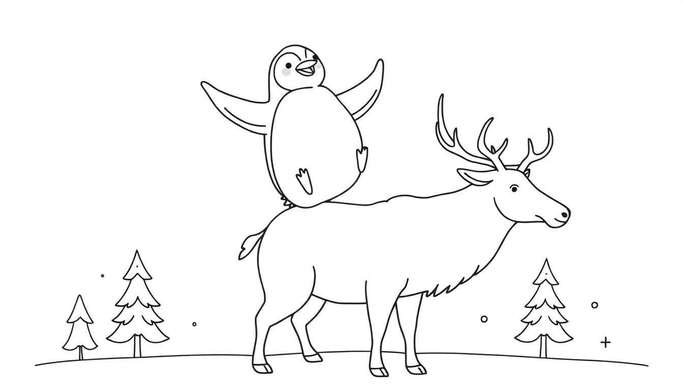 Ontdek deze vrolijke zwart-witte kleurplaat van een pinguïn die op de rug van een rendier staat, omringd door kerstbomen en vallende sneeuwvlokken. Perfect voor een gezellige winteractiviteit!