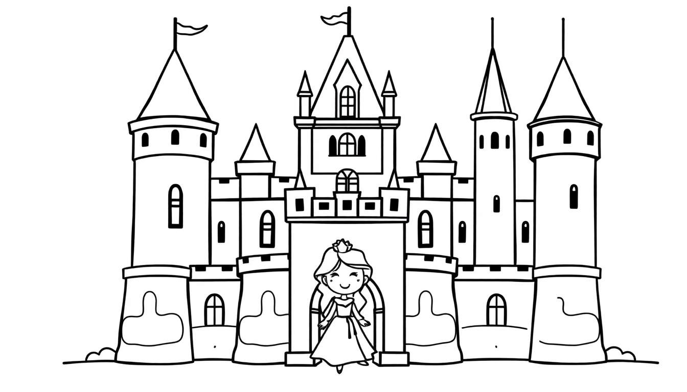 Een vrolijke zwart-wit kleurplaat van een majestueus kasteel met wapperende vlaggen en een schattige prinses die glimlacht voor de hoofdingang. Perfect voor urenlang kleurplezier!
