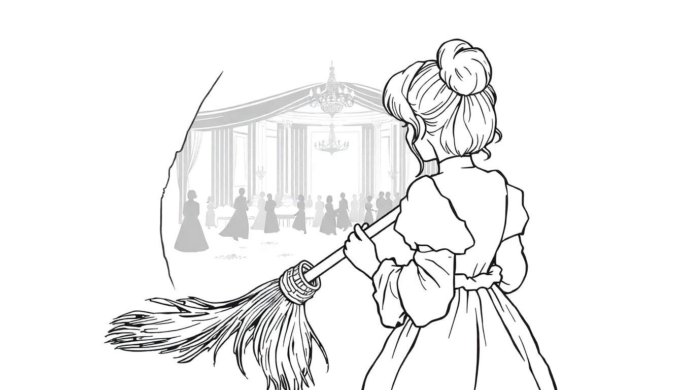 Een sfeervolle kleurplaat met grijstinten, waarop een meisje met haar rug naar de kijker toe, een bezem vasthoudt en verlangend door een opening kijkt naar een uitbundig bal in een weelderige zaal. Perfect voor fans van klassieke sprookjes.