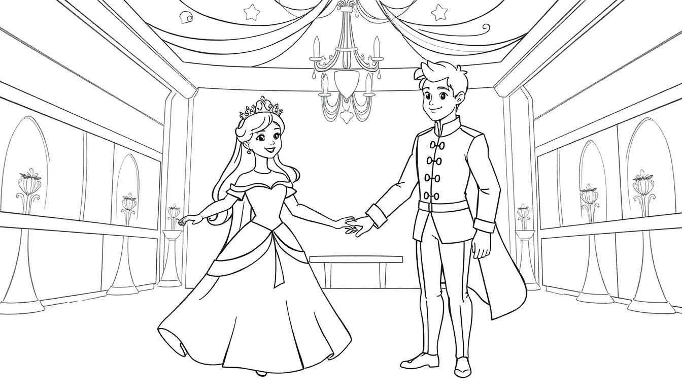 Kleurplaat van een prinses en een prins die hand in hand staan in een uitbundige balzaal, klaar voor een koninklijke dans. Perfect voor creatieve kinderen die van sprookjes houden.