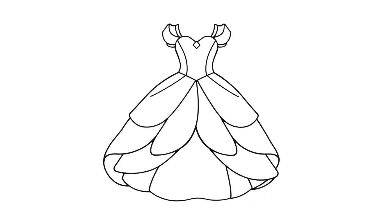 Gratis printbare kleurplaat van een elegante prinsessen galajurk. De jurk heeft een hartvormige halslijn, off-shoulder poffende mouwtjes en een wijd uitlopende rok met golvende lagen. Perfect voor creatieve kinderen en volwassenen die van mode en sprookjes houden.