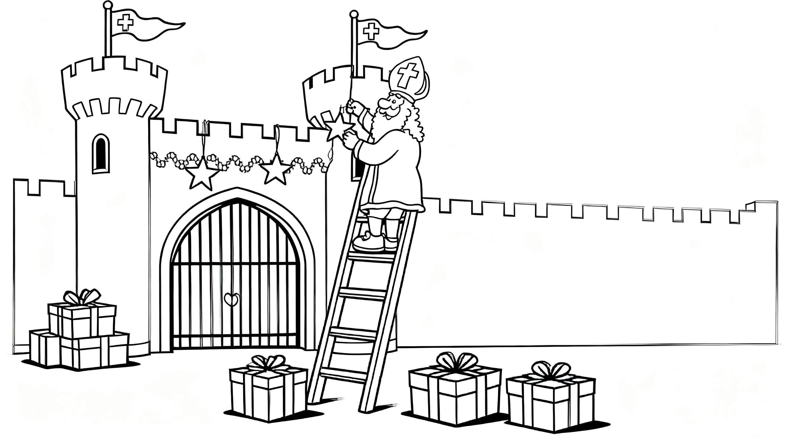 Deze feestelijke zwart-wit tekening, die speciaal is ontworpen als kleurplaat, toont een levendige Sinterklaasscène rondom een imposant kasteel. Het kasteel is voorzien van hoge muren, kantelen en een prominente toren met een wapperende vlag waarop een kruis staat. Aan de voet van de toren bevindt zich een raam. Een grote, zware poort, die doet denken aan een valhek, geeft toegang tot het kasteel en is versierd met een liefdevol hartje. Boven de poort hangen al feestelijke slingers en sterren. Rechts van de poort is Sinterklaas zelf te zien, staand op een ladder. Hij draagt zijn kenmerkende mijter met kruis, lange baard en mantel, en is druk bezig met het ophangen van een grote ster als extra decoratie aan de kasteelmuur. Boven Sinterklaas wappert nog een vlag met een kruis. Op de grond liggen links drie gestapelde cadeaus met strikken en rechts nog eens drie losse pakjes. Het geheel straalt een heerlijke sfeer van voorbereiding op het Sinterklaasfeest uit, perfect om in te kleuren en tot leven te brengen.