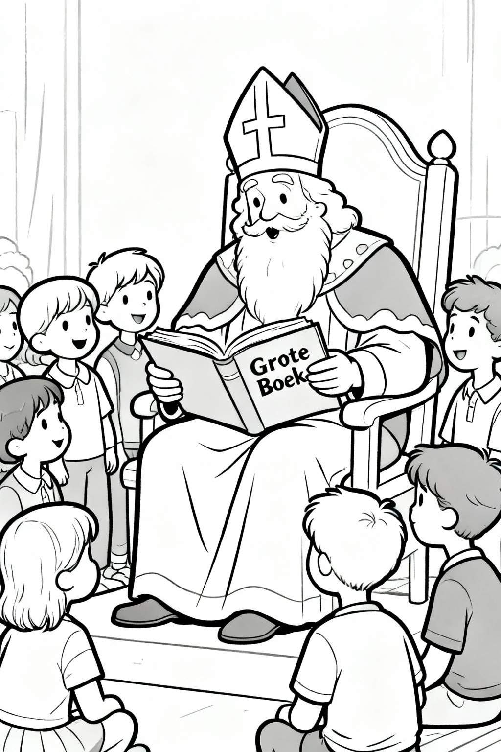 Ontdek deze prachtige Sinterklaas kleurplaat van een sfeervol voorleesmoment! Sinterklaas zit majestueus op een grote, versierde stoel die lijkt op een troon, met zijn traditionele mijter en lange, witte baard, en leest aandachtig voor uit het Grote Boek, waarop duidelijk ‘Grote Boek’ te lezen is. Rondom hem luisteren gefascineerde kinderen met open monden naar zijn verhalen. Een perfecte kleurplaat om de gezellige Sinterklaasperiode mee te vieren, vol traditie en betovering voor jong en oud.