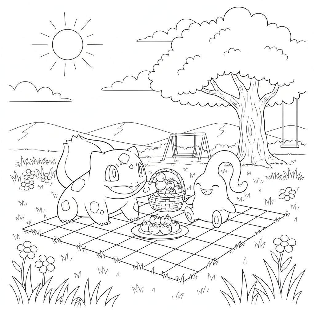 Stel je voor dat je op een stralende dag een picknick in het park houdt, omringd door vrolijke Pokémon! Deze kleurplaat brengt precies die sfeer tot leven. Bulbasaur, met zijn kenmerkende plantenknop op zijn rug, en de lieve, slijmerige Goomy hebben hun perfecte plekje gevonden op een geruit kleed. Met een mand vol heerlijke vruchten en de zon hoog aan de hemel, is dit het perfecte tafereel om je creativiteit de vrije loop te laten. Welke kleuren geef jij hun favoriete bessen?