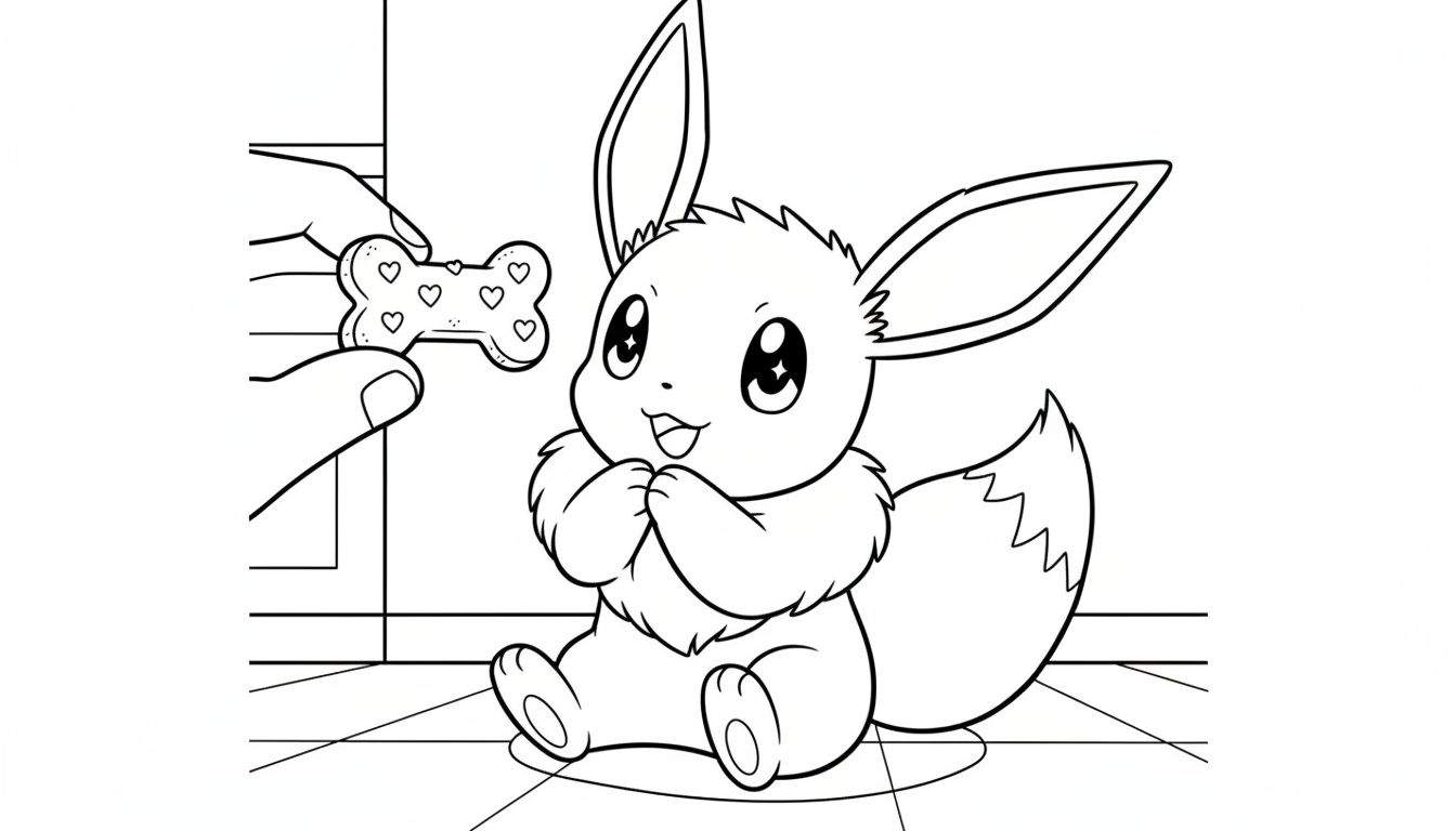 Een hartverwarmende zwart-wit lijntekening van Eevee, ontworpen als kleurplaat. Eevee zit met zijn pootjes bij elkaar en kijkt met grote, glanzende ogen vol verwachting omhoog. Boven hem is een hand zichtbaar die een botvormig koekje met kleine hartjes vasthoudt. De eenvoudige achtergrond met vloerlijnen nodigt uit tot creatief inkleuren. Perfect voor Pokémon-fans en kinderen die dol zijn op Eevee.