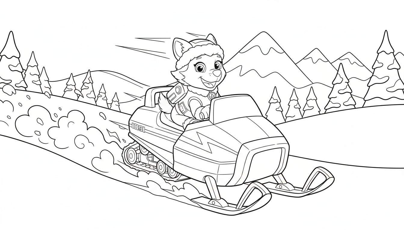 Everest Paw Patrol Kleurplaat: Vrolijk Hondje op Sneeuwscooter in Winter Wonderland