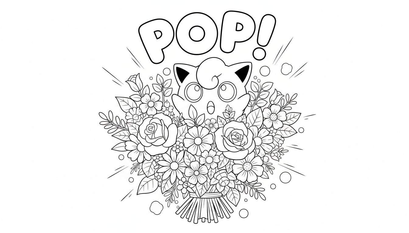 Een charmante zwart-wit lijntekening die dient als kleurplaat, met in het middelpunt een groot en gedetailleerd boeket bloemen. Uit het hart van dit bloemenboeket springt een schattig, rond figuurtje tevoorschijn, sterk gelijkend op Jigglypuff van Pokémon. Het figuurtje heeft grote, wijd open ogen, een open mond en katachtige oren, wat een uiterst verbaasde of verraste uitdrukking teweegbrengt. Boven het figuurtje staat prominent het woord “POP!” geschreven in speelse, ronde letters. Rondom Jigglypuff en het boeket zijn dynamische lijnen en kleine cirkels getekend, die het effect van een uitbarsting, beweging en de verrassing visueel versterken. Het boeket is rijk aan details, met duidelijk herkenbare rozen, margrietachtige bloemen en veel groen blad, alles met scherpe contouren klaar om ingekleurd te worden.