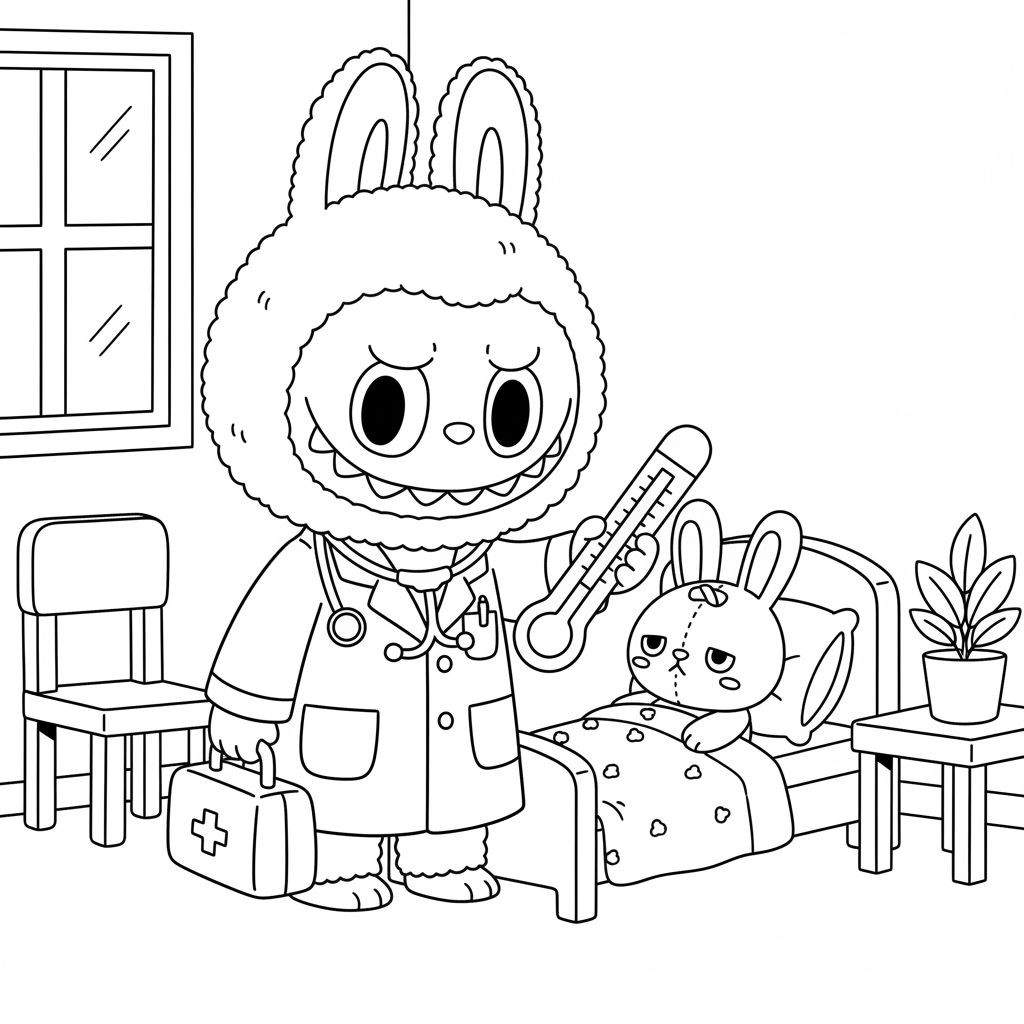 Ontdek deze unieke zwart-wit kleurplaat van een doktersbezoek in Labubu-stijl! Een groot, harig konijnachtige dokter in witte jas met stethoscoop glimlacht breed terwijl hij een thermometer vasthoudt en zijn dokterskoffer draagt. De kleinere konijnachtige patiënt ligt ziek in bed onder een deken met hartjes en stippen, met een kussen onder het hoofd. Let op de schattige maar vermoeide uitdrukking en de kleine hechtingen op het hoofd en lijfje, kenmerkend voor de Labubu-wereld. Op de achtergrond zie je een raam, een stoel en een nachtkastje met een plant. Perfect voor urenlang kleurplezier en het tot leven brengen van dit bijzondere doktersmoment!