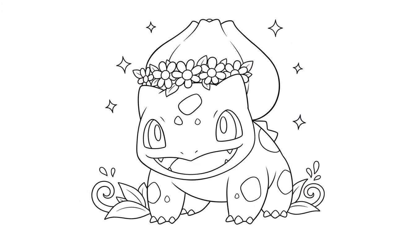 Een gedetailleerde zwart-witte lijntekening, perfect als kleurplaat, met in de hoofdrol een schattige en vrolijke Bulbasaur. Deze geliefde Pokémon draagt zijn iconische grote, ongeopende bloembol op zijn rug en is versierd met een sierlijke bloemenkrans van kleine bloemetjes op zijn hoofd. De Bulbasaur lacht breed, waarbij zijn tandjes zichtbaar zijn, en straalt puur plezier uit. Rond zijn voeten zijn sierlijke krullende plantenranken met bladeren afgebeeld, die de natuurlijke habitat van deze gras-Pokémon benadrukken. Op de achtergrond zweven kleine, vierpuntige sterretjes, wat een speels en sprankelend effect toevoegt aan de afbeelding.