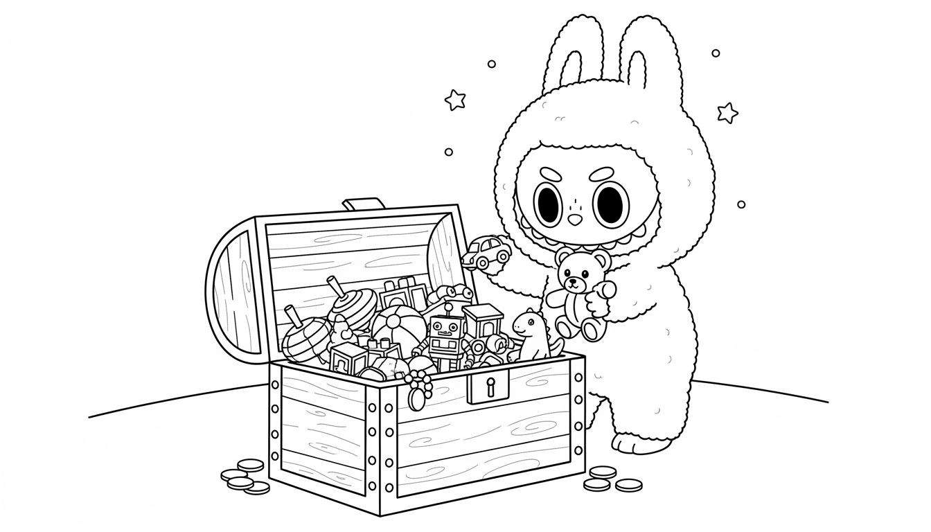 Een charmante zwart-wit kleurplaat toont Labubu, het iconische pluizige figuurtje met lange oren, in de hoofdrol. Labubu staat stralend naast een wijd open houten schatkist die overloopt van vrolijk speelgoed. In de ene hand houdt hij een klassieke knuffelbeer vast, terwijl hij in de andere hand een speelgoedautootje bewondert. De schatkist onthult een rijke verzameling aan items zoals kleurrijke tollen, bouwblokken, een robot, een bal, en een dinosaurusfiguurtje, met een kralenketting die er speels uit hangt. Voor de kist liggen glimmende muntjes op de grond, en speelse sterretjes en cirkels zweven rond, wat een magische sfeer creëert. Deze vrolijke scène nodigt uit tot uren kleurplezier!