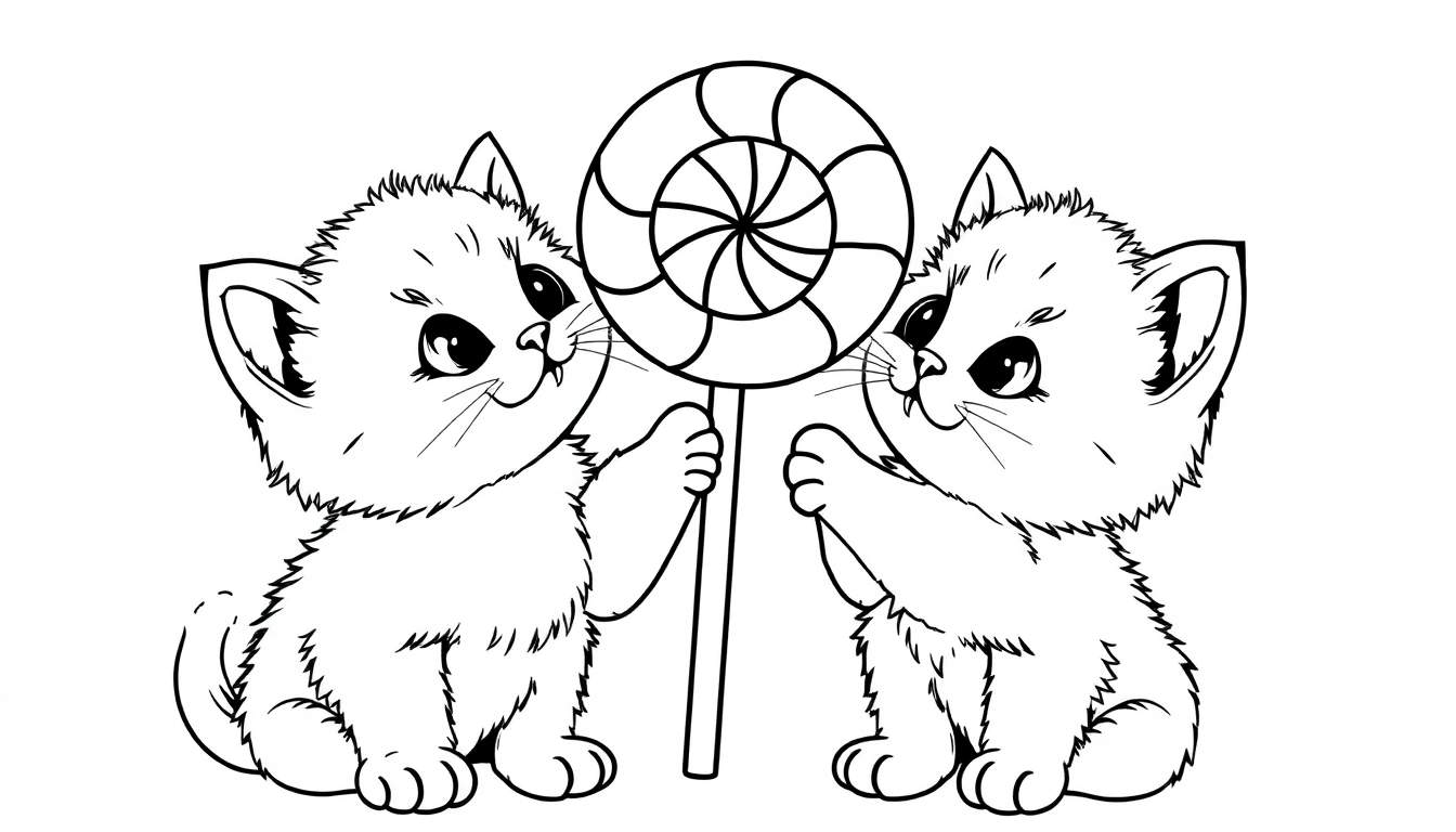 Ontdek deze schattige zwart-wit lijntekening van twee pluizige kittens die samen een grote, ronde, spiraalvormige lolly delen. Perfect voor kinderen om in te kleuren en plezier te hebben!