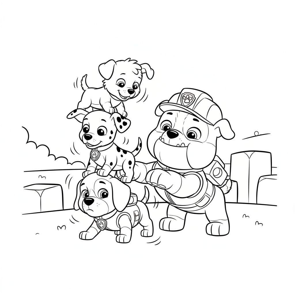 De tekening toont Rubble, de betrouwbare bulldog, stoer aan de rechterkant als de stevige basis, compleet met zijn bouwhelm en werkgordel. Aan de linkerkant zie je een indrukwekkende stapel van drie puppy’s: bovenaan een kleine, vrolijke pup met puntige oren, daaronder Marshall, de enthousiaste dalmatiërbrandweerhond, met zijn kenmerkende stippen en een brede glimlach. Onderaan die stapel bevindt zich een puppy met hangoren en een geconcentreerde blik, die de balans bewaart. Deze dynamische opstelling belichaamt de kernwaarden van Paw Patrol: “Geen klus te groot, geen pup te klein!”