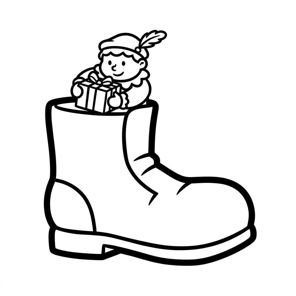 Een schattige zwart-wit kleurplaat speciaal voor peuters, met een grote, stevige laars waarin een vrolijk kaboutertje of elfje zit. Dit kleine figuurtje draagt een muts met een veer, heeft een glimlachend gezicht met stippen als ogen, en houdt een ingepakt cadeau met strik vast. Perfect voor creatieve peuters die houden van laarzen, kabouters en cadeautjes, en op zoek zijn naar een vrolijke en schattige tekening om in te kleuren.