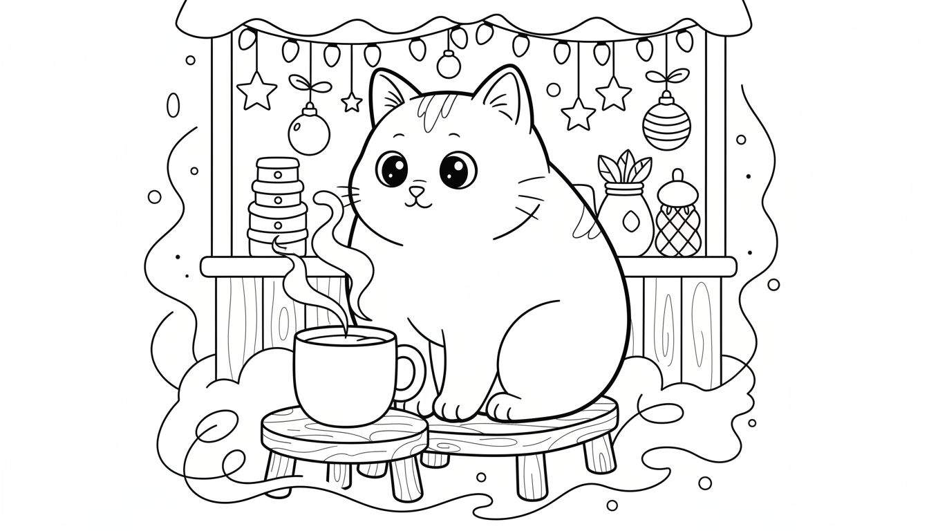 Ontdek deze schattige, ronde kat met grote ogen die geniet van een warme drank in een gezellige, feestelijk versierde setting. Perfect voor een knusse kleurervaring!