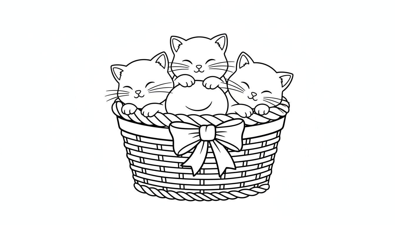 Download deze schattige zwart-wit lijntekening van drie pluizige katjes die vredig in een rieten mand dutten. Perfect om in te kleuren en de fantasie de vrije loop te laten!