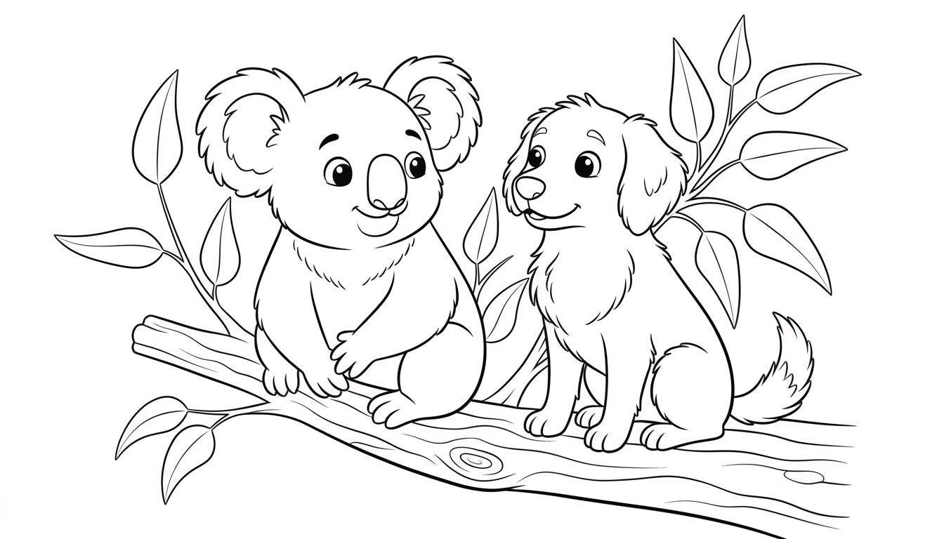 Een lieve zwart-wit tekening van een koala en een hond die samen op een boomtak zitten. Ideaal voor kinderen om in te kleuren en de band tussen dieren te ontdekken.