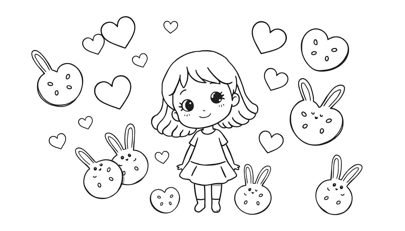 Een vrolijke kleurplaat voor kinderen, met een lief meisje omringd door zwevende hartjes en schattige, koekjes-achtige konijnenfiguurtjes. Perfect om creativiteit te stimuleren!