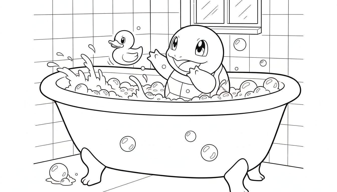 Deze schattige zwart-wit tekening tovert onmiddellijk een glimlach op je gezicht. Zie hoe Squirtle, de iconische water-Pokémon, een heerlijk ontspannend bad neemt. Met overvloedig schuim, vrolijke zeepbellen en zelfs een klein badeendje aan zijn zijde, is dit de perfecte scène om tot leven te brengen met kleur.