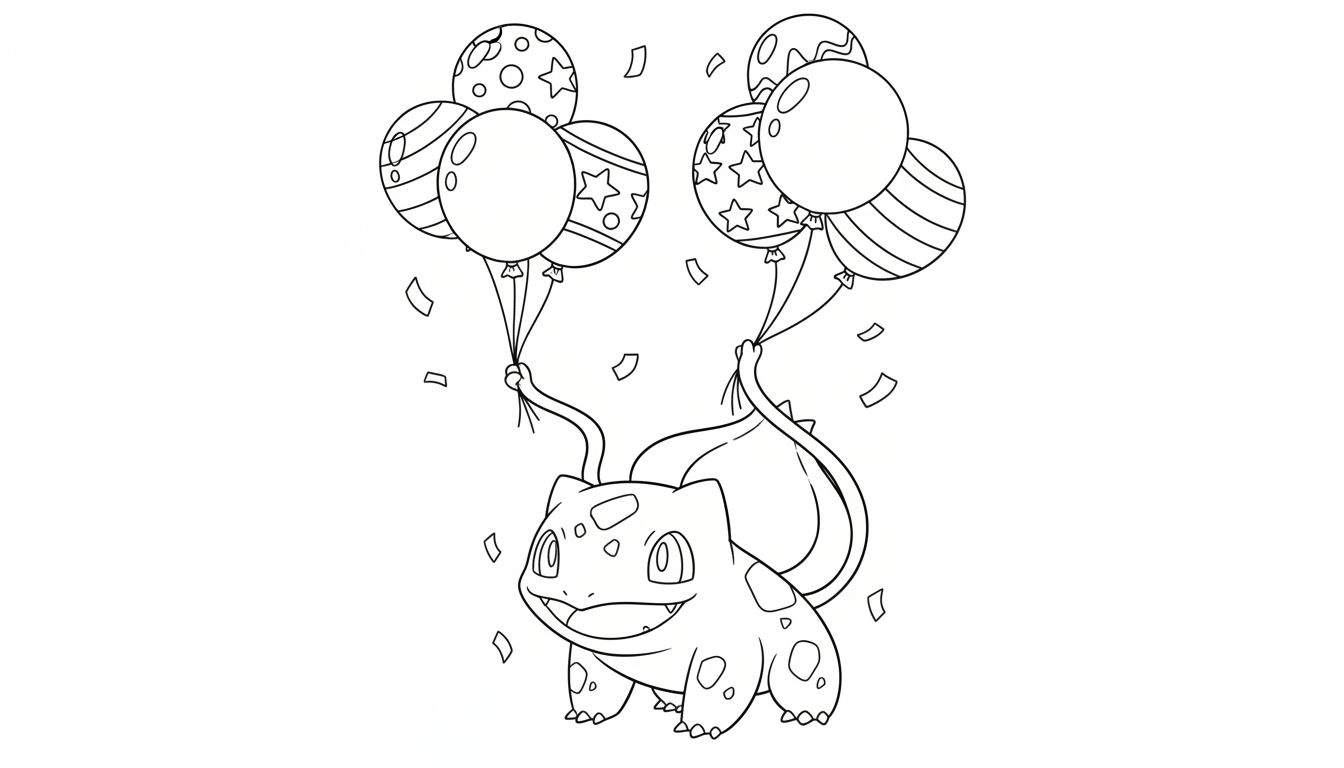 Deze bijzondere kleurplaat brengt de geliefde gras/gif-type Pokémon Bulbasaur tot leven in een scène vol feestvreugde. Centraal staat een Bulbasaur met een brede, aanstekelijke glimlach, die met zijn karakteristieke lianen twee trossen kleurrijke ballonnen stevig vasthoudt. De variatie in de ballondesigns – van effen tot stippen en sterren – nodigt uit tot een creatieve uitbarsting van kleuren, waardoor elke kleurplaat uniek wordt.